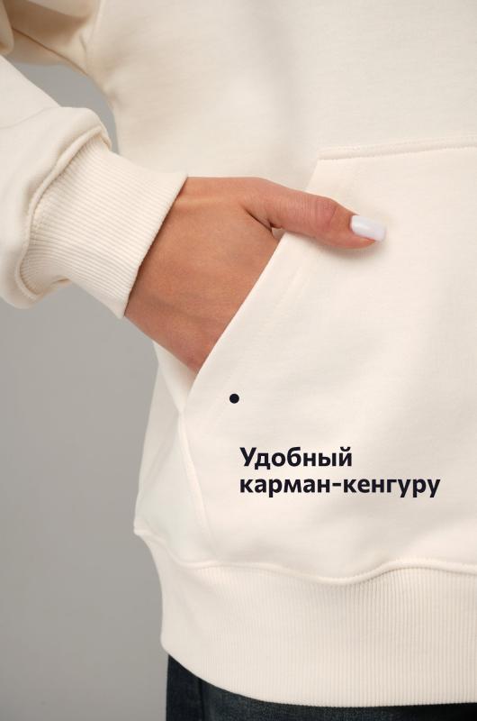 Идеальный базовый выбор для осени и весны! Женская толстовка молочного цвета сочетает уют и стиль в одном свитшоте. Однотонная толстовка легко впишется в повседневный гардероб и станет вашей любимой моделью на каждый день.; Преимущества: ; – мягкий и плотный трикотаж футер трехнитка (плотность 310 г-м2); ; – хлопковая основа для комфорта и дышащих свойств; ; – полиэстер для эластичности и долговечности; ; – карман кенгуру для мелочей или тепла рук; ; – эластичные манжеты на рукавах и поясе для защиты от прохлады.; Свободный крой оверсайз со спущенным плечом создаёт расслабленный силуэт. Трикотажный демисезонный свитшот для женщин идеально подходит для домашнего отдыха, прогулок или встреч на свежем воздухе в осенний или весенний день.; Рост модели 170 см, параметры: объем груди 88, объем талии 67, объем бедер 97 см. На ней размер 44.; Бренд Happyfox ; Страна: Узбекистан ; Состав: 70% хлопок, 30% полиэстер ; Материал: Футер трёхнитка ; Плотность ткани: 310 г-м2