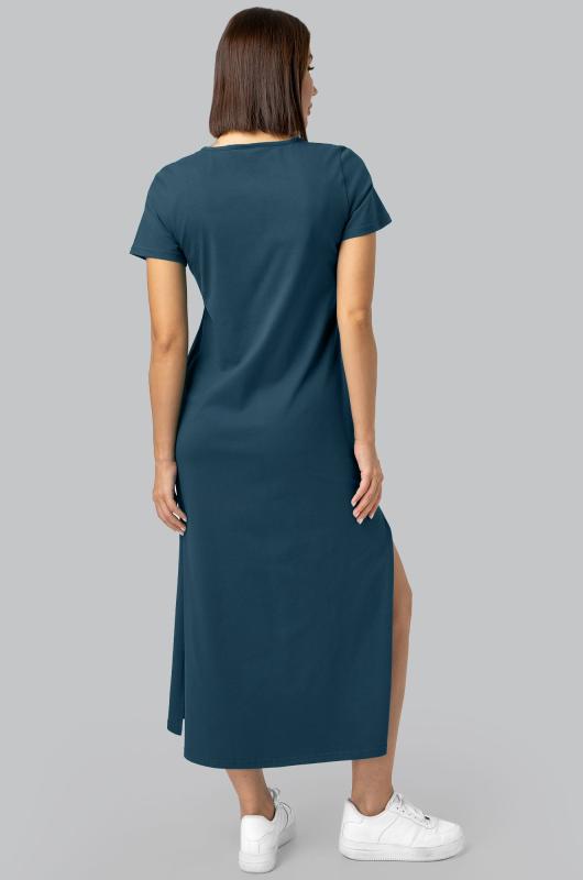 Женское платье-футболка из 100% хлопка — стильная и удобная модель для повседневных образов.; Преимущества:; — домашнее платье-футболка для женщин выполнено из натурального 100% хлопка, мягкого и дышащего;; — мягкий трикотаж кулирная гладь (145 г-м2) отличается легкостью, прочностью и износостойкостью;; — хлопковое платье сохраняет форму и цвет даже после многократных стирок;; — прямой крой и короткий рукав дарят комфорт и свободу движений;; — длинное платье с разрезами по бокам смотрится стильно и практично.; Однотонное сине-зеленое платье миди подходит для дома. Трикотажное свободное платье подойдет на каждый день.; Бренд Happyfox ; Страна: Россия ; Состав: 100% хлопок ; Материал: Кулирная гладь ; Плотность ткани: 145 г-м2