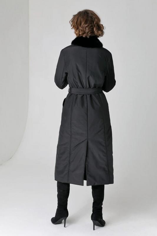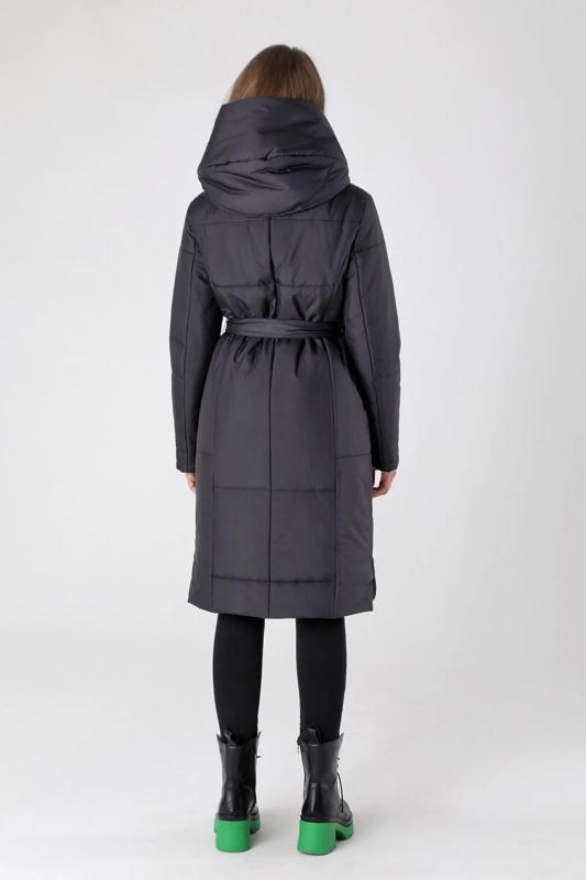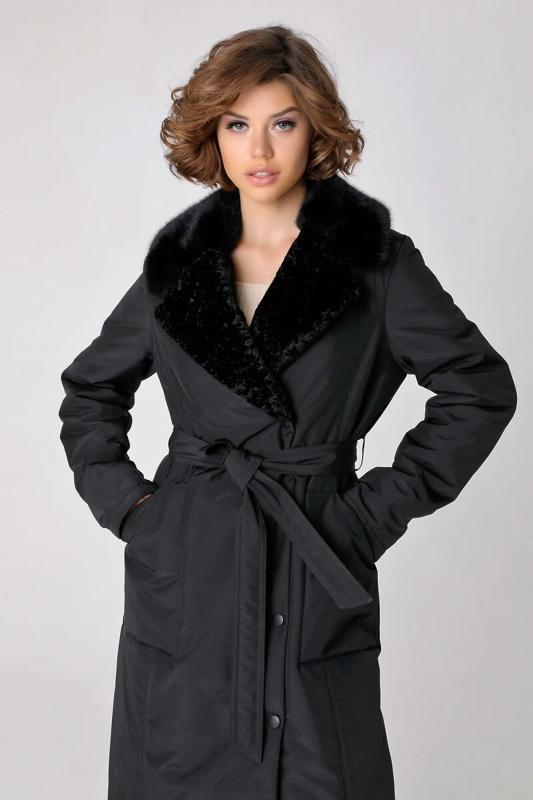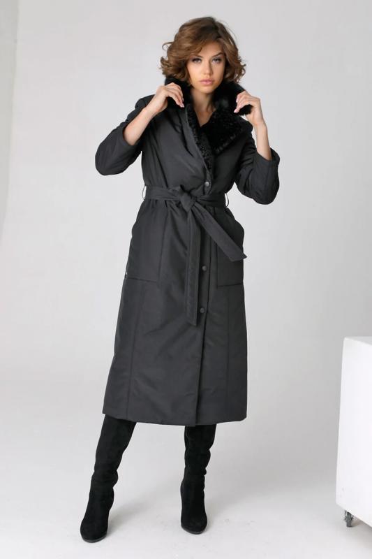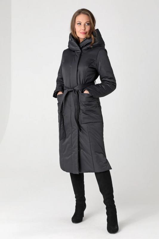 Пальто с накладными карманами и поясом.