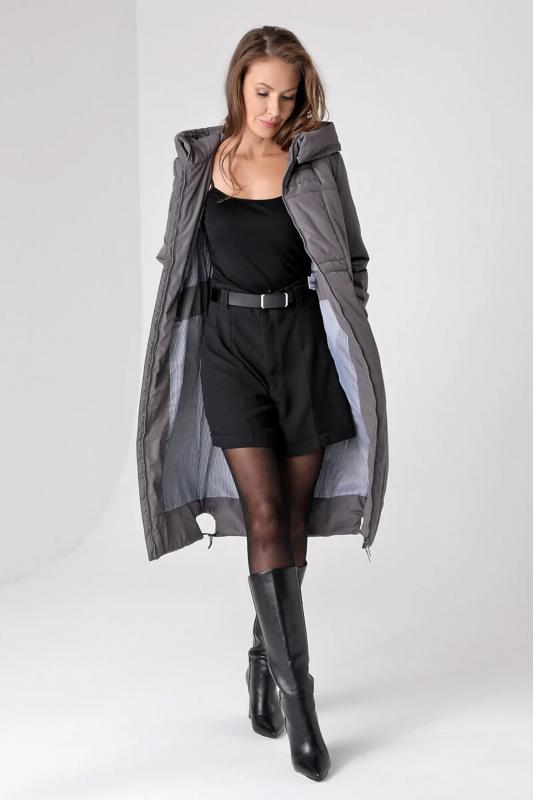 вида с лацканами. Съемный капюшон позволяет не только защищать Вас в непогоду, но и менять Ваш образ! Эта стильная удлиненная куртка выручит Вас осенью, весной и ранней зимой. Плащевая ткань имеет водоотталкивающую пропитку, которая выдержит небольшой осенний дождь или снег. Хорошо зарекомендовавший себя утеплитель Холлофайбер плотностью 150 гр-м защитит от холода. Подкладка в изделии - в мелкую полоску.