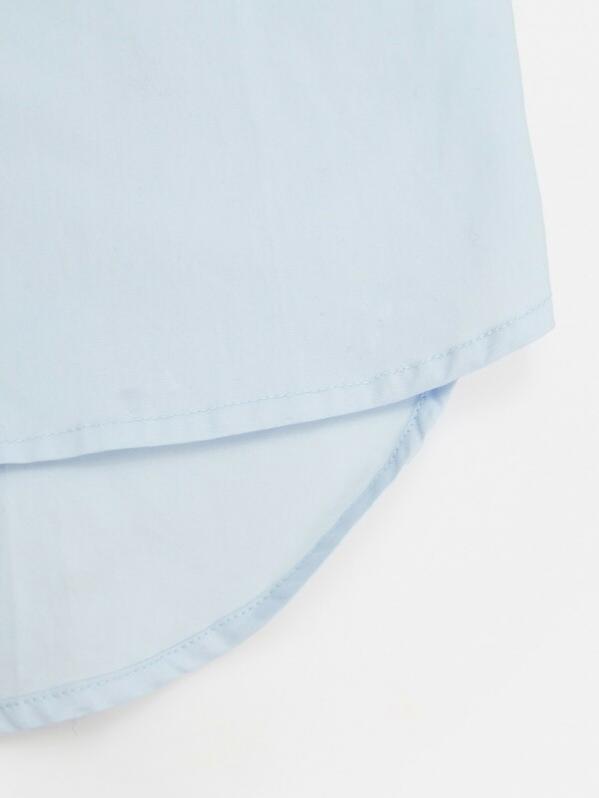Рубашка для девочки без рукавов, выполнена из поплина в мелкий принт. Воротник рубашечный на стойке, застежка планка на пуговицы. На спинке кокетка. Впереди накладной карман. Низ рубашки полукруглой формы.