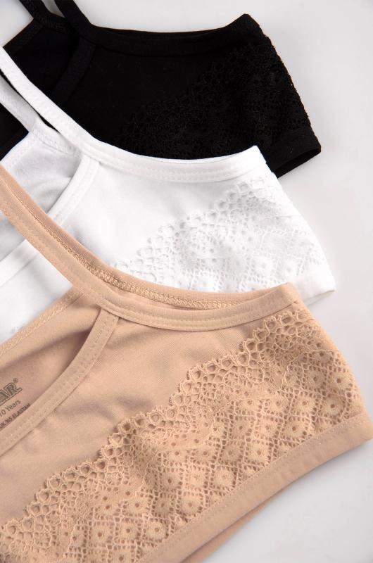 Набор из 3 шт. топиков для девочки и девочки-подростка — это основа для идеального комфорта в любой день. Облегающий крой детского бюстика на тонких бретелях создаёт аккуратный силуэт, а нежное кружево добавляет образу милой изюминки. В наборе — три классических цвета для полной универсальности (белый, черный и бежевый).; Преимущества:; — идеальная посадка и пластичность благодаря эластану в составе;; — невероятная мягкость и комфорт хлопкового трикотажа;; — изящный и деликатный кружевной декор на каждом топе;; — практичность набора из трёх базовых цветов.; Подростковый комплект бельевых топов на лямках станет любимой основой гардероба юной красавицы.; Бренд Baykar ; Серия: Baykar: Basic lingerie Girls ; Страна: Турция ; Состав: 95% хлопок, 5% эластан