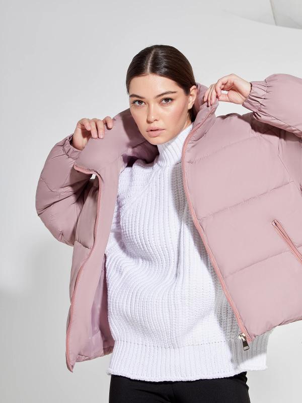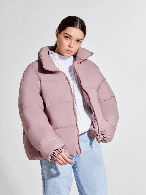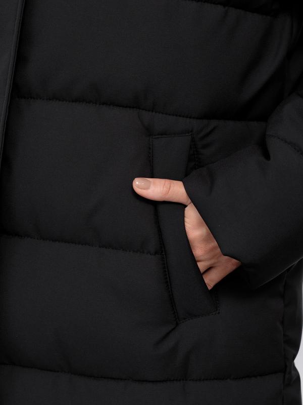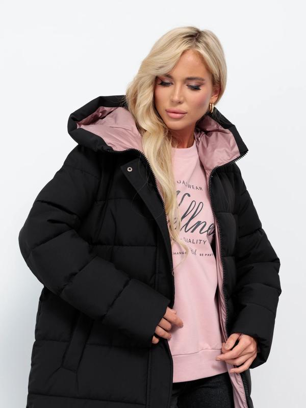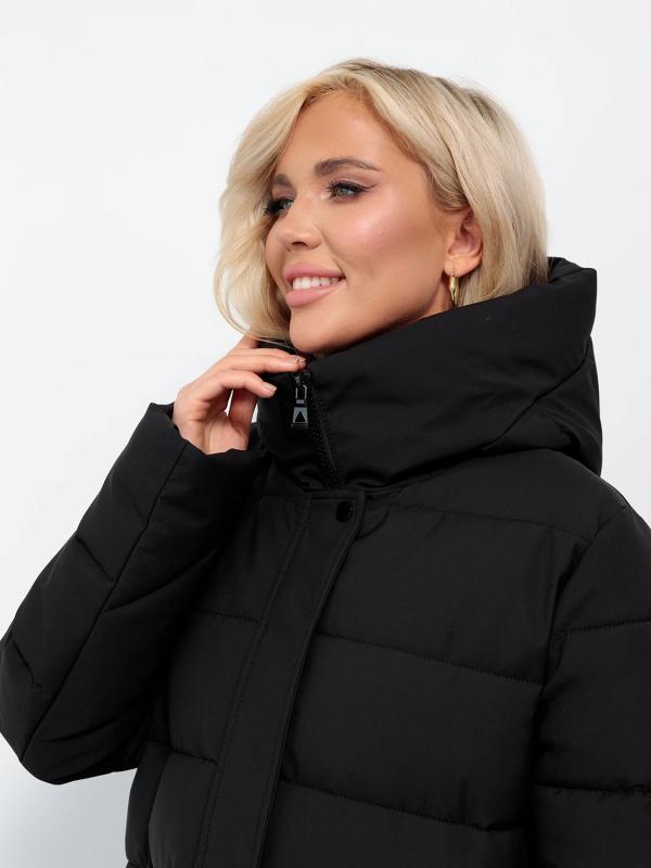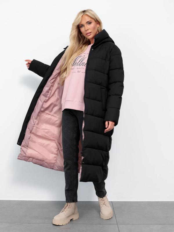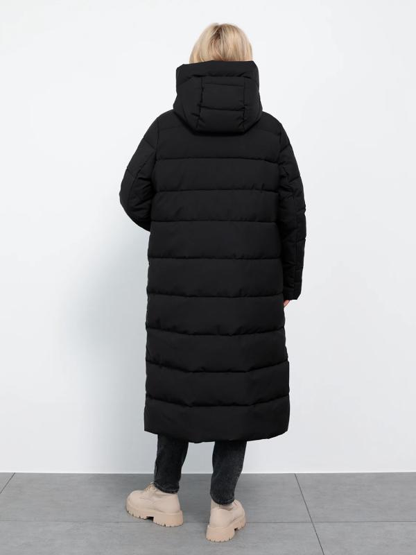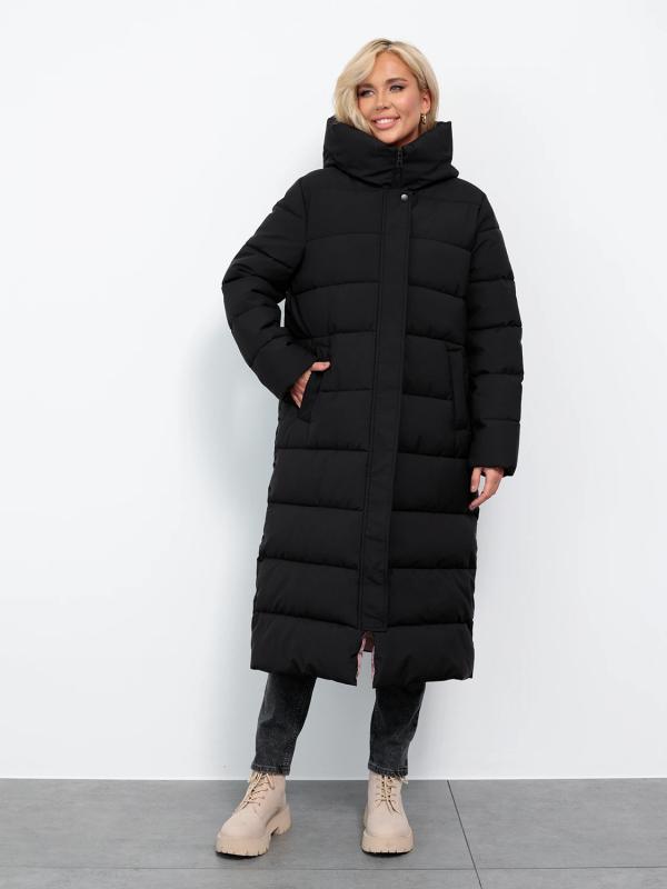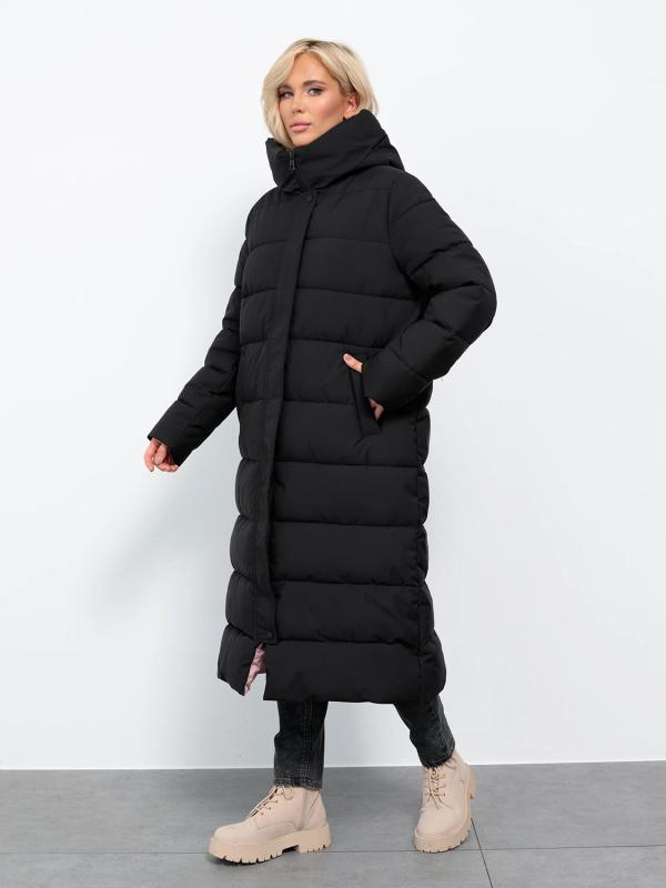 Длинный стильный пуховик прямого кроя с глубоким капюшоном.