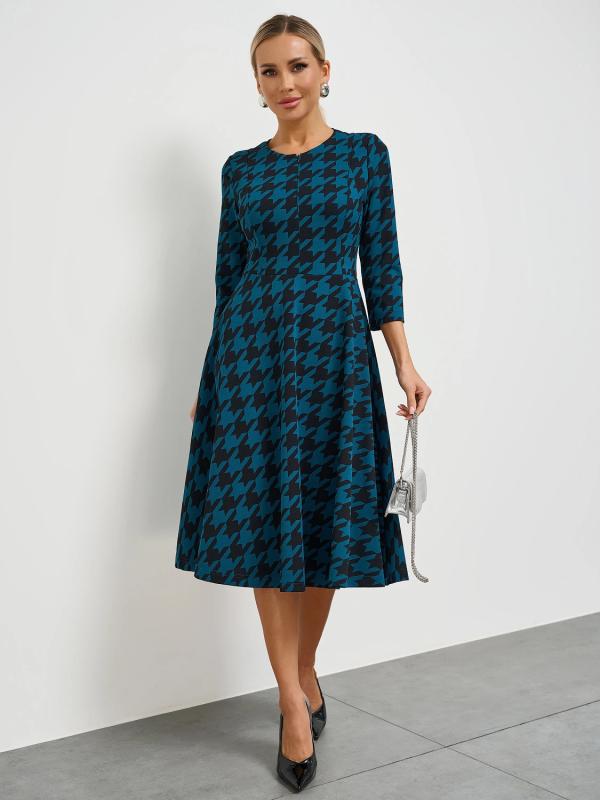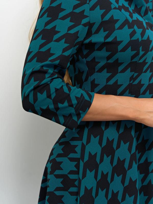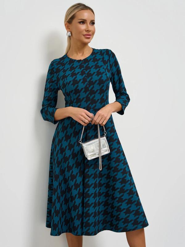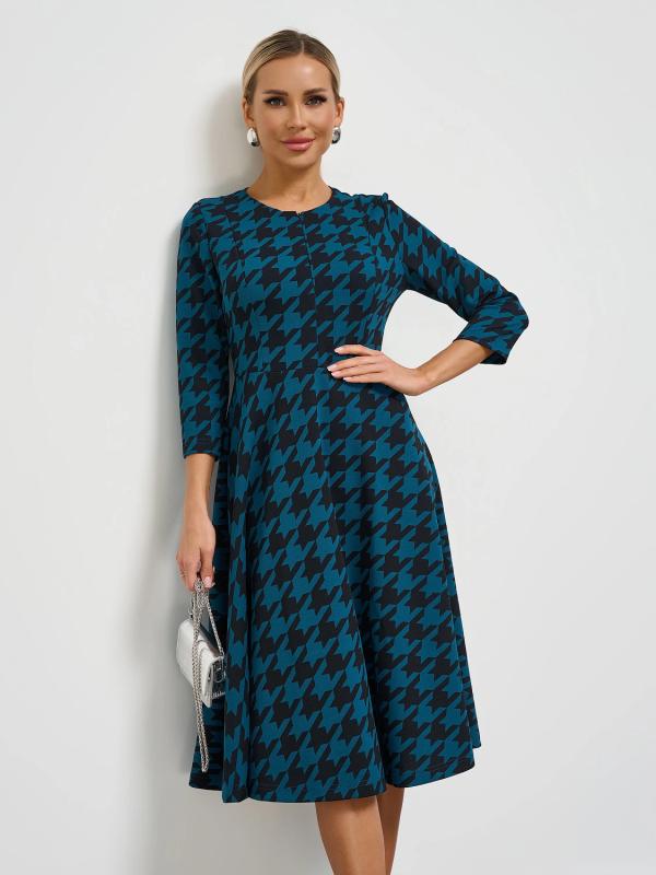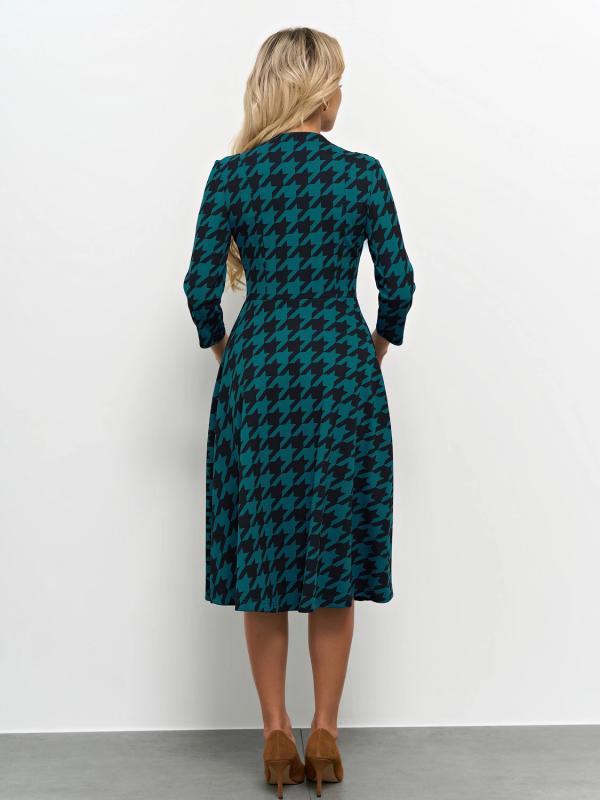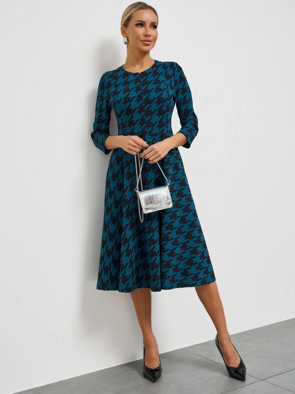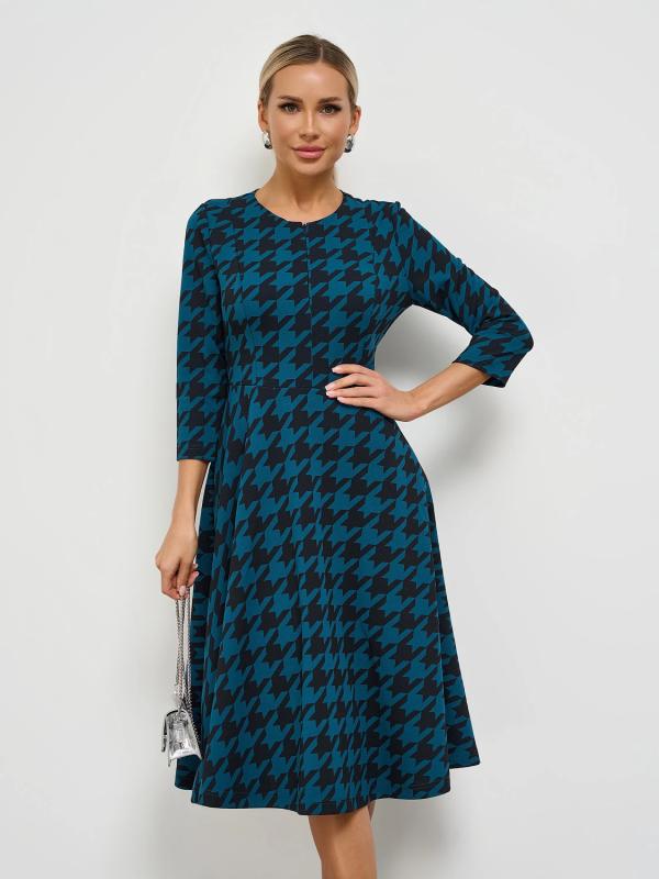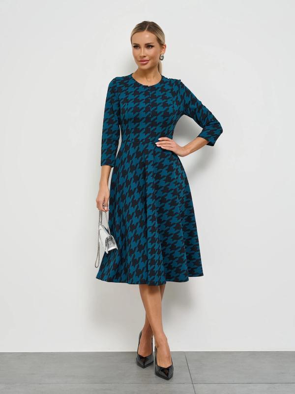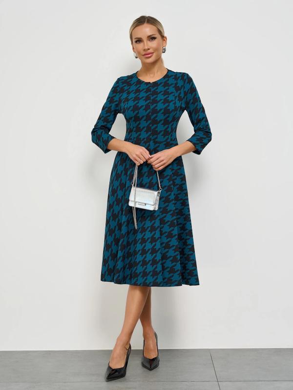 Платье отрезное по линии талии, с расклешенной юбкой.