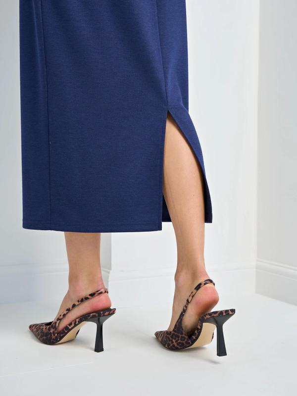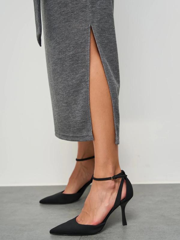 В боковом шве-высокий фигурный разрез.