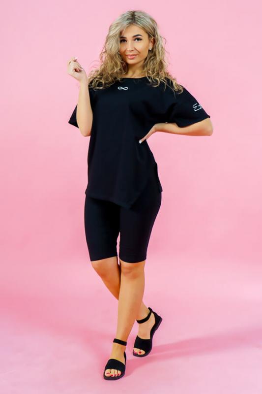 Молодежный летний костюм с печатью на футболке. Футболка свободной силуэтной формы, ассиметричного кроя, со спущенной линией плеча и О-образной горловиной. Велосипедки прилегающей силуэтной формы, длиной до колена, на эластичной тесме (резинке).