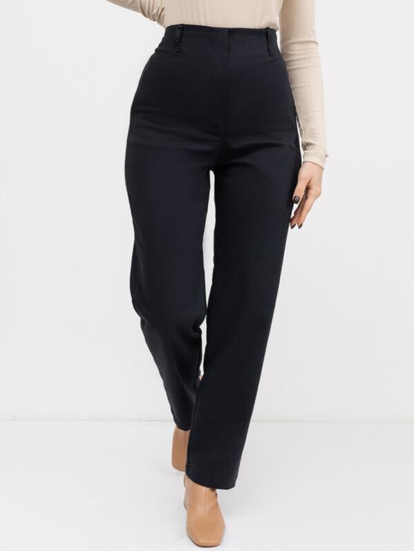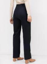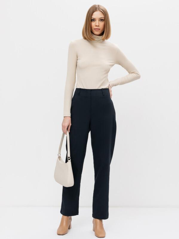 Однотонные женские брюки прямого силуэта. Спереди пояс цельный, с имитацией гульфика и шлевками для ремня. В боковом шве брюки застегиваются на потайную молнию. Длина модели классическая, полная. Рекомендуем в качестве базовой модели!
